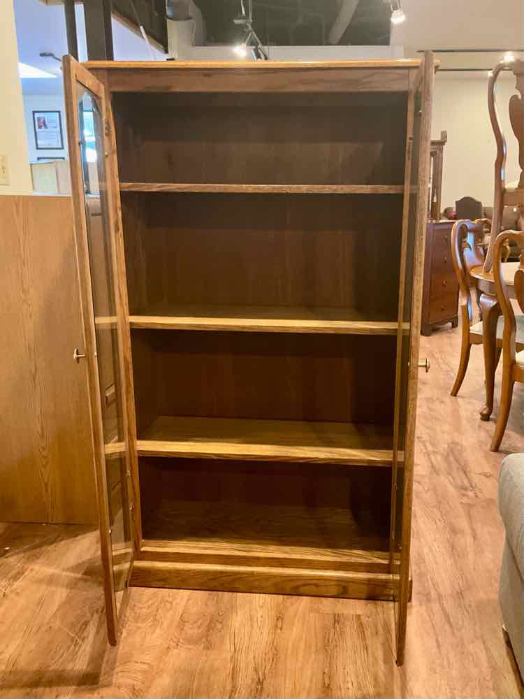 Apartment Size Oak Display Cabinet | 57.5"H x 34.25"W x 12.5"D | REDUCED PRICE | NOW $95.00 | WAS $100.00 #1613-485 SHIPPING NOT AVAILABLE. ALL SALES ARE FINAL.